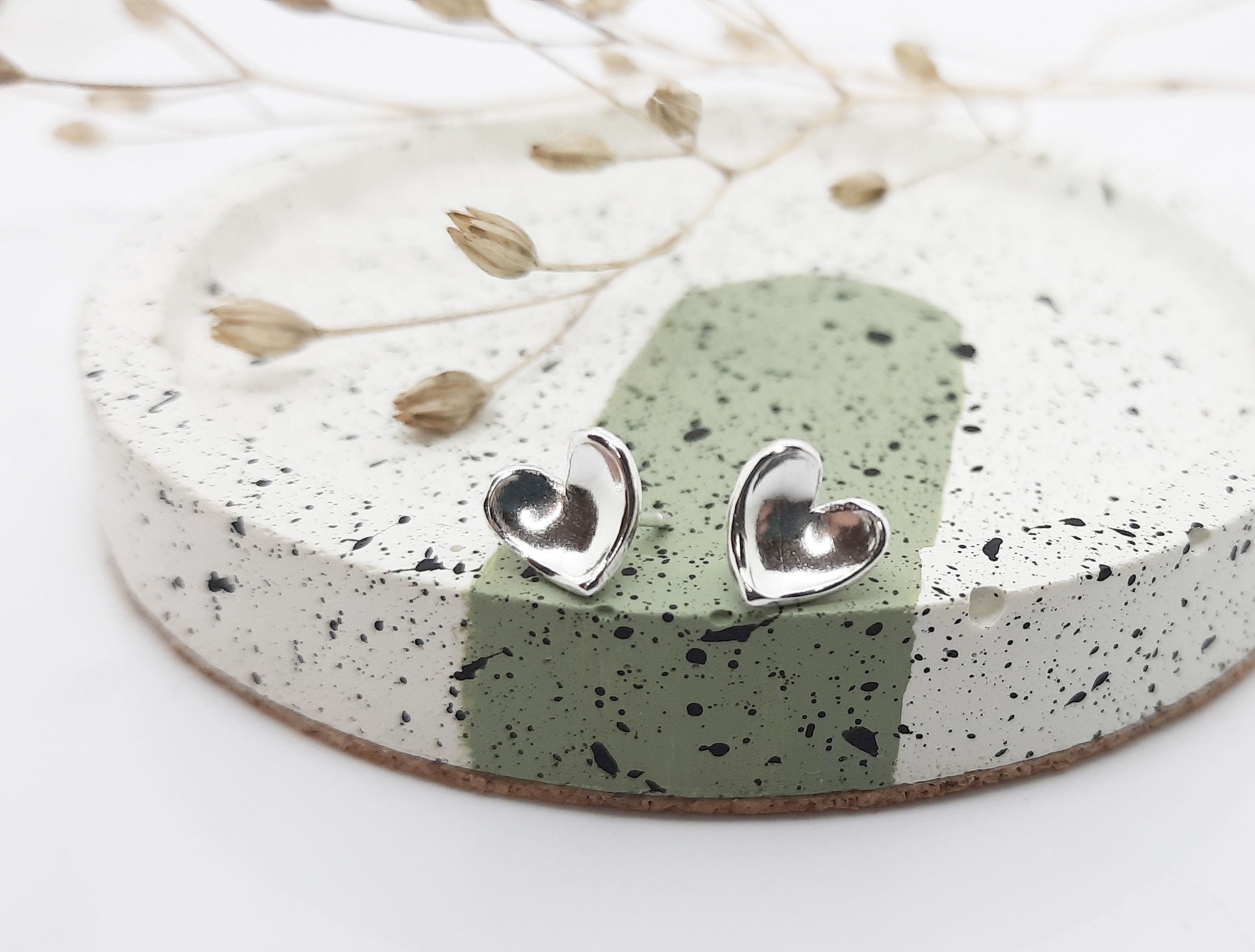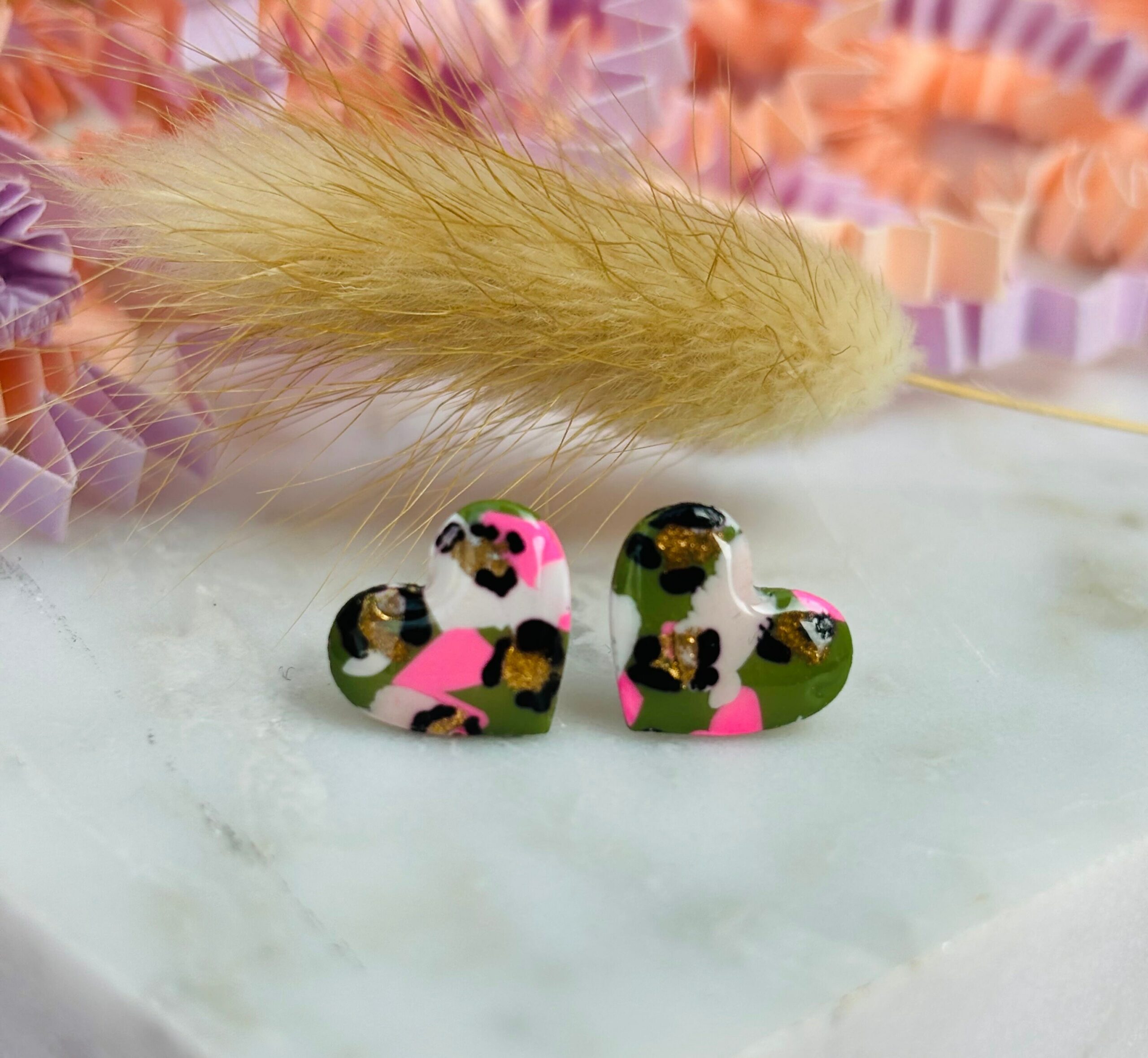 Small chic leopard print style heart stud earrings, gorgeous green, pink, gold – Cool & Unique polymer clay handmade, pretty chic wild studs